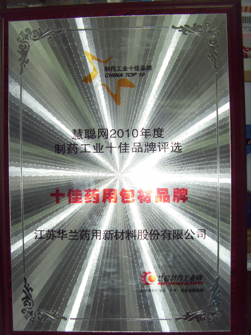 2011年8月18日,由慧聰制藥工業網主辦的“創新•責任•影響力——2010年度制藥工業十佳品牌評選”頒獎盛典在北京釣魚臺國賓館隆重舉行。經過行業專家層層評審,慧聰揭曉了“十佳制藥裝備民族品牌”、“十佳制藥裝備創新品牌”、“十佳制藥裝備新銳品牌”、“十佳藥用原輔料品牌”、“十佳藥用包材品牌”、“十佳配套設備品牌”六大獎項。我公司“華蘭”品牌在本次評選中榮獲“十佳藥用包材品牌”稱號。