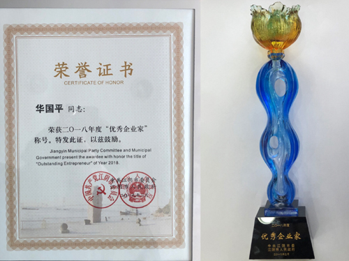 表彰會(huì)上,公司董事長華國平先生榮獲2018年“江陰市優(yōu)秀企業(yè)家”稱號(hào),全市共評(píng)選表彰優(yōu)秀企業(yè)家35名。